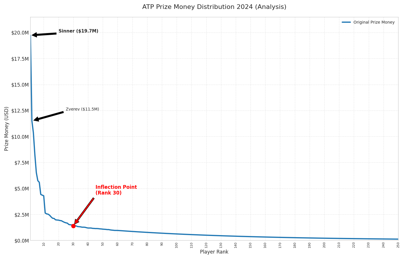 In 2024 Jannik Sinner ended the season with about 19.7 million dollars in prize money alone (and almost 24 with ATP year-end bonuses), Alexander Zverev with over 11 million, Carlos Alcaraz with just over 10. Adding up just the top ten in 2024, you go well beyond 80 million dollars in prize money. In other words, in a single season the very best absorb an enormous share of the money tennis distributes to players in prize money.