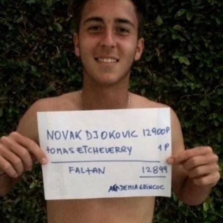 And then there’s the other oddity — the one that makes him immediately tellable without having to invent metaphors: Etcheverry has a relationship with Novak Djokovic that isn’t decorative idol-worship, but method. In 2016, when he gets his first ranking point, he poses for a photo holding a sign: he has 1, Djokovic has 12,900, and the distance is written as a subtraction.