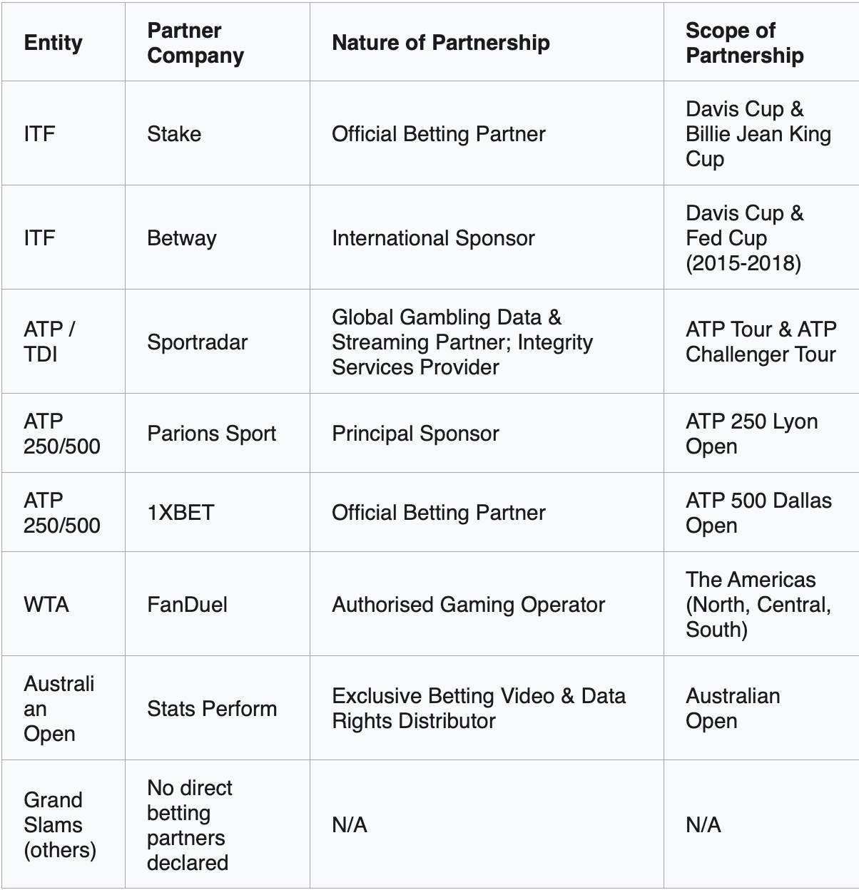 The International Tennis Federation (ITF), the world governing body of tennis, has forged direct, high-profile partnerships with betting companies, placing their brands at the centre of its most prestigious competitions.