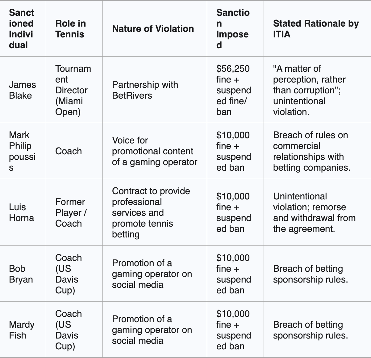 Case of James Blake (Miami tournament director): Blake was fined $56,250 (with a much larger fine and ban suspended) for a partnership with BetRivers. The ITIA CEO Karen Moorhouse’s statement was illuminating: