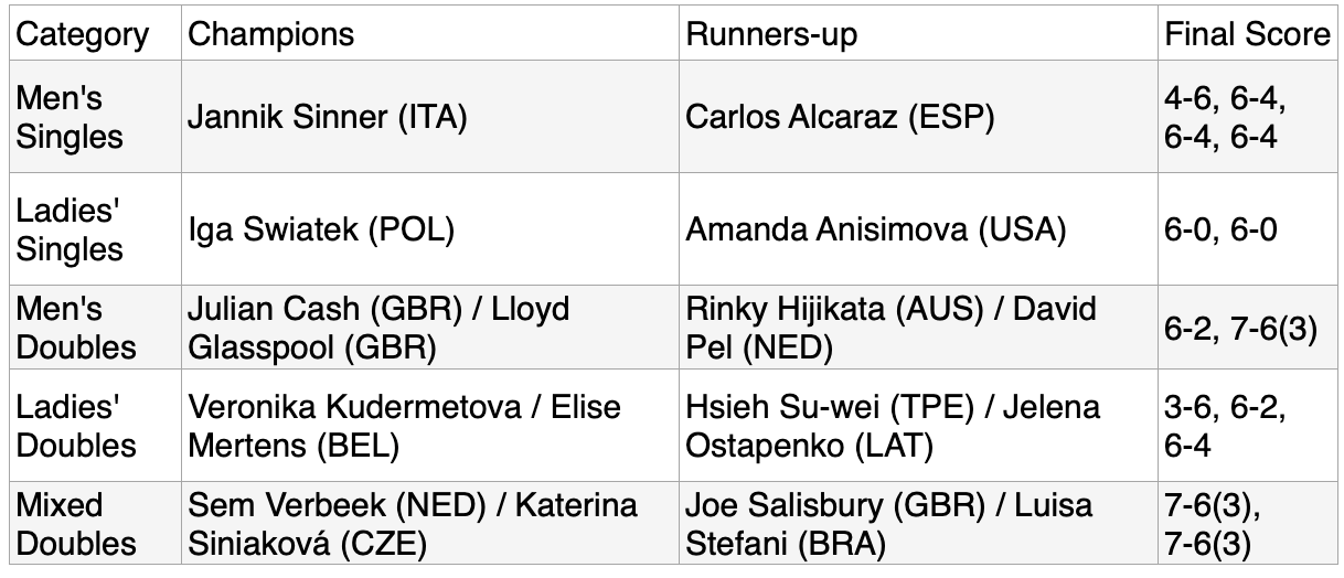 The third and fourth sets followed the same script, with Sinner in full tactical and emotional control. The Italian minimised his unforced errors, punishing every slight uncertainty from Alcaraz with surgical precision. The key moment, the one that symbolised his definitive maturation, came in the fourth set. At 4-3, Sinner found himself facing two consecutive break points at 15-40, a situation frighteningly similar to the one that had cost him the final in Paris. This time, however, the outcome was different. With Olympian calm, he saved both opportunities, held his serve, and powered towards victory. The match concluded after three hours and four minutes with a service winner, his eighth ace of the match, which sealed the final score of 4-6, 6-4, 6-4, 6-4.With this triumph, Sinner not only became the first Italian tennis player to win Wimbledon but also claimed his fourth Grand Slam title.